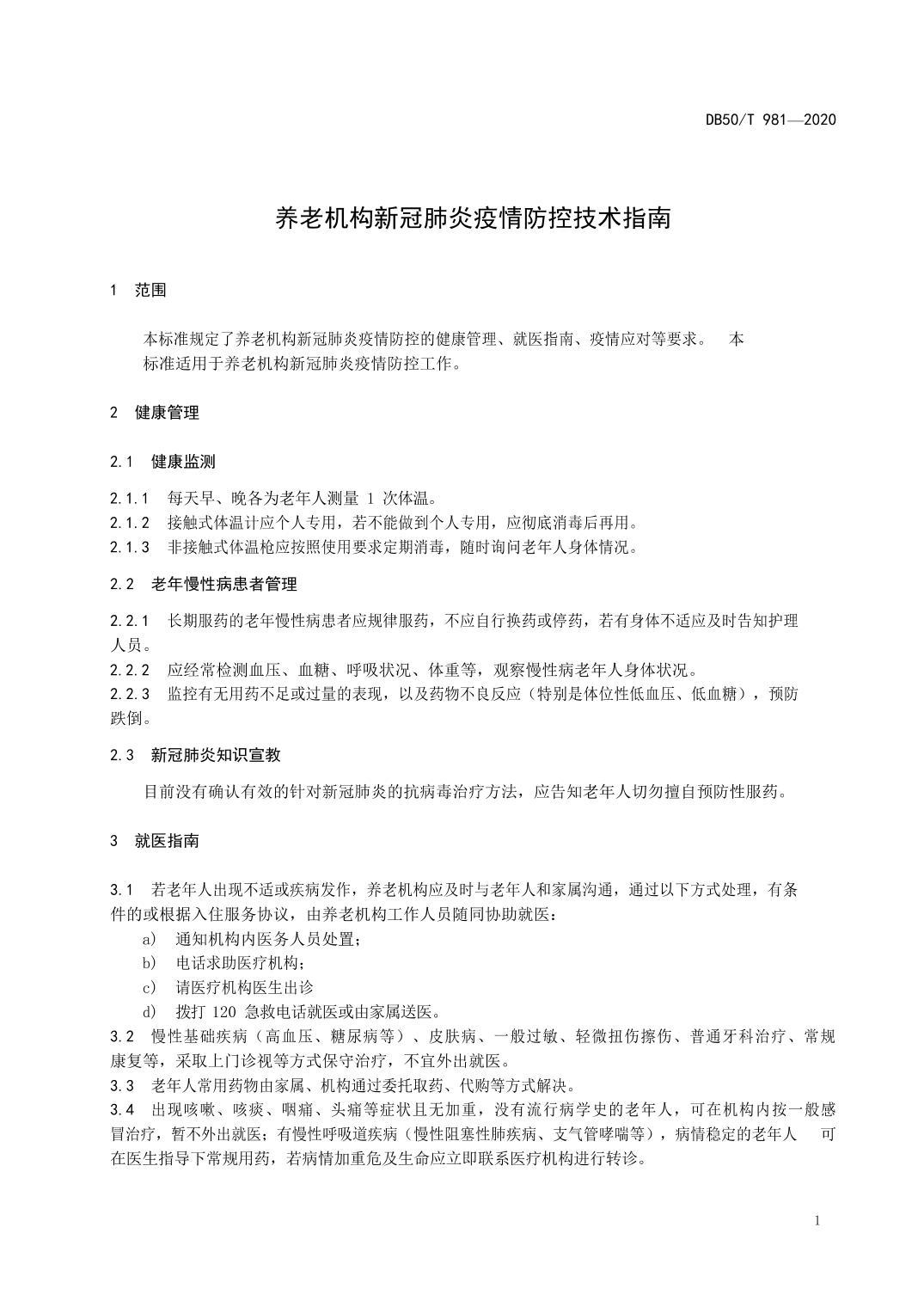 - DB 50/T 981-2020 养老机构新冠肺炎疫情防控技术指南