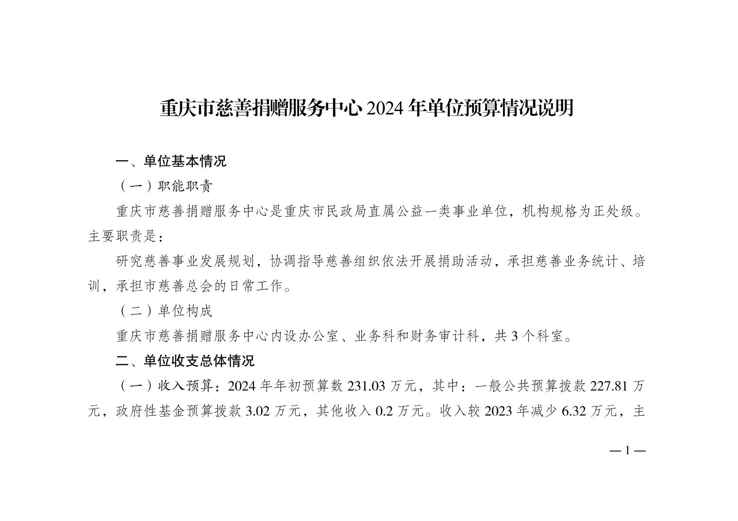- 重庆市慈善捐赠服务中心2024年单位预算情况说明